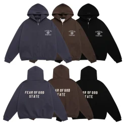 Description: The Fear of God Full Zip Hoodie is a versatile rendition of the high-end Streetwear icon, offering greater styling flexibility than its pullover counterpart. It maintains the brand’s signature relaxed oversized fit and is crafted from premium, heavy-duty cotton fleece. Featuring a high-quality metallic zipper and refined, minimal detailing, this hoodie is the perfect layering piece, asserting a sophisticated, modern, and elevated status in street fashion.