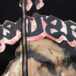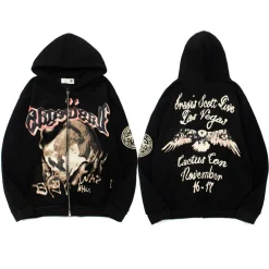 Discription:  The Travis Scott Graphic Print Full Zip Hoodie is an exclusive Cactus Jack merchandise piece, offering greater versatility with its full-length zip-up design. This hoodie maintains the signature oversized fit, is constructed from heavy-duty fleece, and includes a practical hood and side pockets. The distinct feature is the bold, expansive graphic prints (often covering the entire garment, including the hood and sleeves), establishing an ultimate streetwear statement with powerful artistic exclusivity.